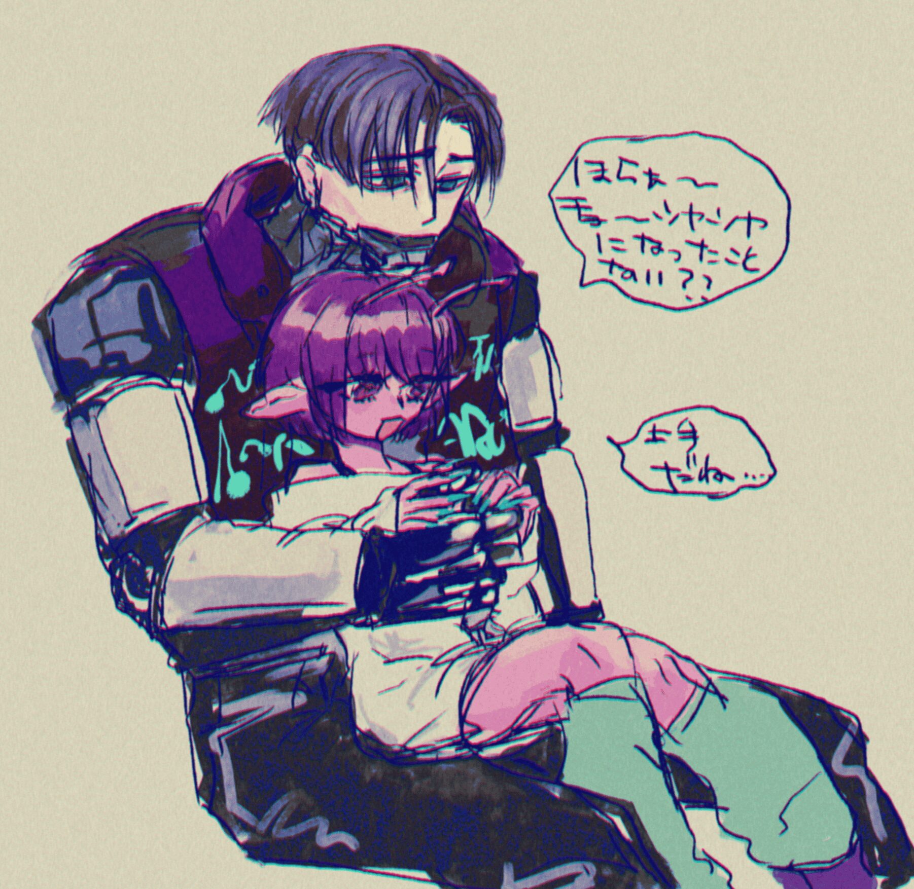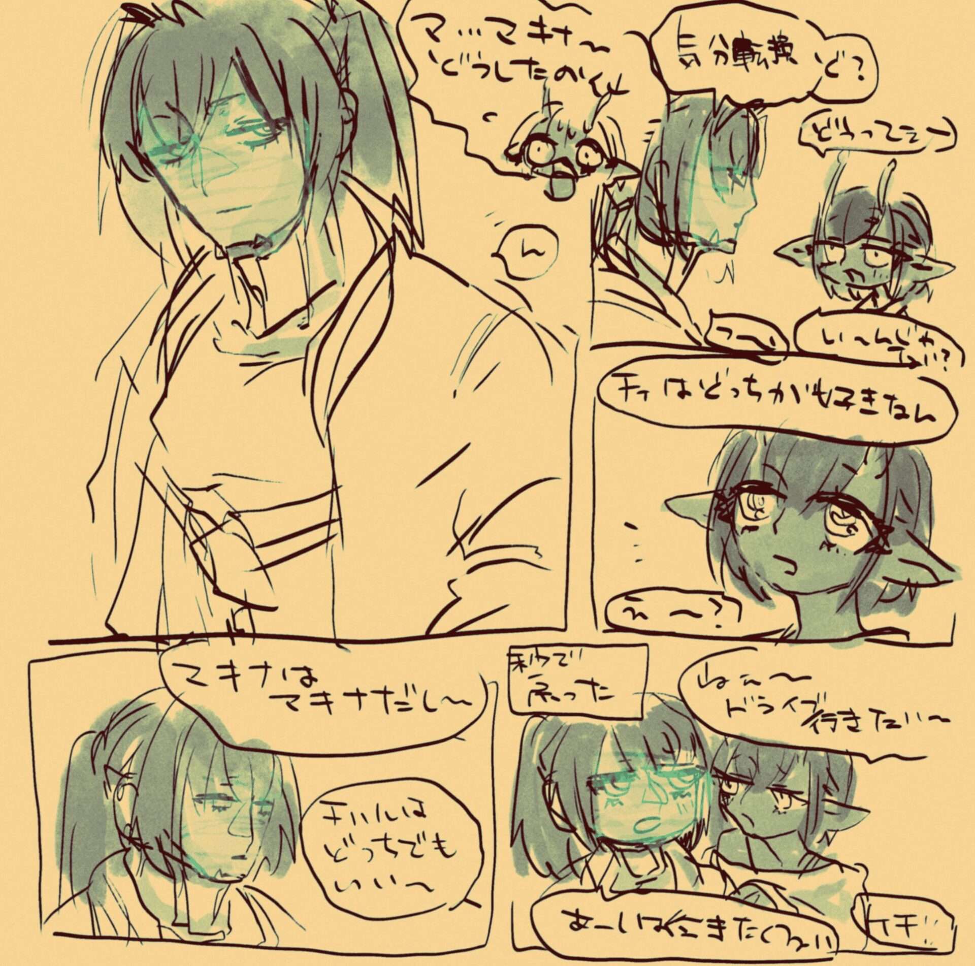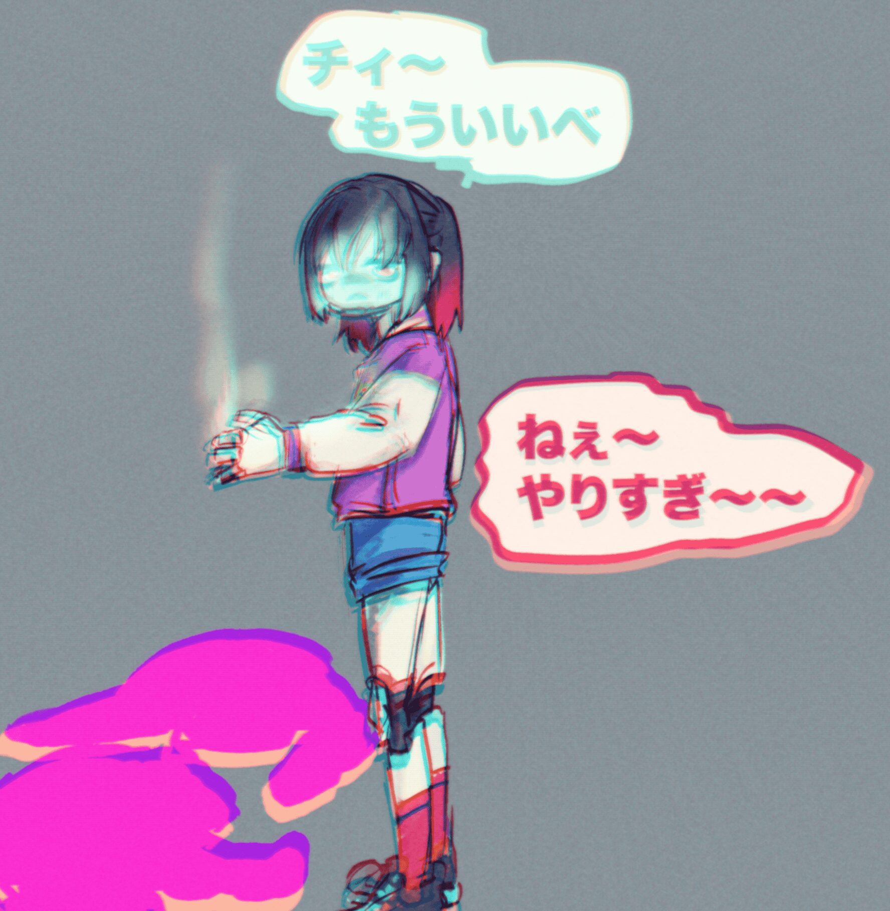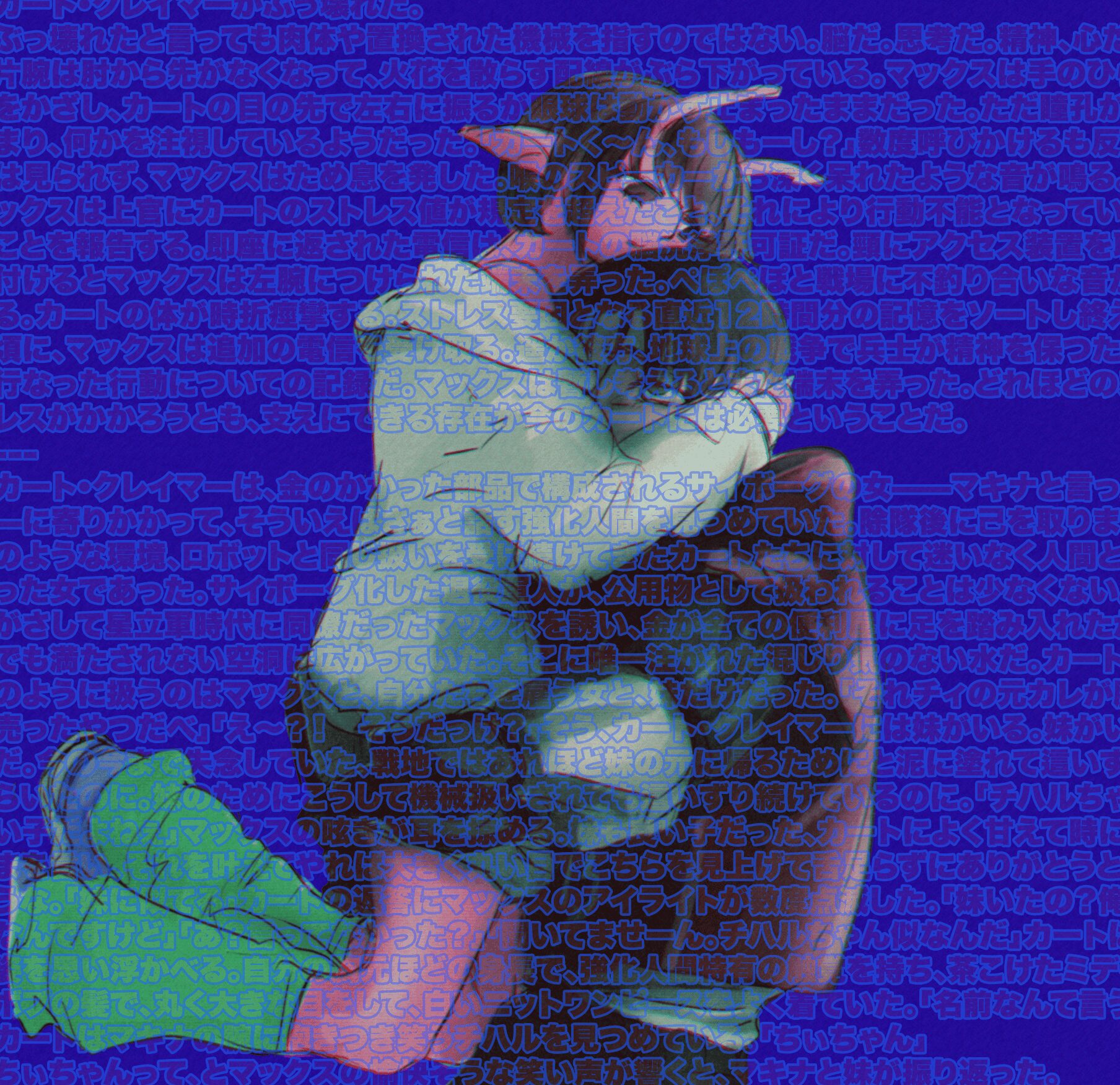 ? @shamigashu 150日前 編集 #マクチハ おわらないよ〜なので進捗はらせてくれ ▽▽▽ 新しく建てられたショッピングモールでは老若男女、人間から強化人間にサイボーグと種の坩堝が蠢き賑わう。マキナは中央に置かれたモニュメント近くのベンチに腰掛けてピンクの触角を追いかけてはタール染みた感情のままに溜め息を繰り返していた。数年が経つというのに、数年しか経っていない、どちらもマキナの本心であり折り合いがつかない憎悪と懇願だ。喧騒の中から強化人間の子供が近寄ってくる。ディスプレイに映るマキナの眉が顰められ、足下に蹲った子供を目で追うと靴の側にはクラシックな形のミニカーがひっくり返っている。子供の指がミニカーを摘み慌てた様子でマキナから離れていく。さんざめく影から掛け声が飛び出した。子供を呼んでいるのだろう。走り去る背中の頼りなさに、手繋いどけよ、とマキナは毒づいた。手を繋いでおけばよかった。ずっと。一瞬でも離すべきではなかった。マキナは体を丸めるように頭を抱えた。そんなことをしても何も解決はしない。彼女はいま楽しげな声の中でただひとりであった。 *** 造りかけのまま放置された建造物の数々は今や立派な不法入星者のたまり場となって、惑星連合も目をつぶっている状態であった。独立戦争をきっかけに噴出した数々の争いの中、まともに生活が出来なくなった者たちの漂着場所としても名高く、つまるところはゴミ捨て場一つくらいは置いておこうということなのだろう。頽れた吹き溜まりのひとつ、ある部屋の中では姿見の前に素体そのもので立つサイボーグがいた。衣服とウィッグが床に散らばって、なにもつけられていない機械造り体、その後頭部には宇宙軍が契約している情報処理用量産型機体の型番が刻印されている。顔部分に取り付けられたディスプレイは忙しなくテキストが表示されては消えていく。 「宇宙軍情報部統一演算課MX515型1940番、」 煤と埃、砂にまみれた部屋に取ってつけられたドア代わりの鉄板が叩かれる。鈍い音が数度繰り返されてから、鉄板が動かされた。 「またやってんのかよ」 赤いジャケットを着込んだサイボーグは、飛び込んだ光景に慣れた呆れと共に声をかける。 「おい、マックス。仕事だぞ」 自身の経歴を諳んじていたサイボーグの音声デバイスから、切り替え音が二度鳴った。ディスプレイが点滅して、視覚用部品のライトが灯る。 「うそぉ、連絡受けてないよ」 戯けた仕草で訪問者に向き直ってから、マックスは「準備するからちょっと待って」と床に散らばっていた服を手に取ると、着いた汚れを落とすように振りかぶる。着々と服を着込み、ウィッグを被りながら改めて姿見に向かうと己の名を繰り返す。 「オーケー、オーケー。お待たせしました、カートくん」 「いいけど。通信切んのはやめろって」 社長ちょっとキレてたぞ、とカートは付け足した。錆びた階段は踏み出すたびに大げさな音を立てて、今にも崩れますといわんばかりに軋んでいる。マックスはカートの肩に腕を回して凭れかかると冗談めかした謝罪を発する。大型機体に寄りかかられても、陸軍特注の近接戦闘用機体は微動だにせずに受け止めた。 「ほんとだぁ、ヤバぁ。俺今度こそスクラップにされちゃうかも」 「なんねーよ。俺らまだ使える道具なんだから」 カートの自虐めいた言い草にマックスは肩を揺らして笑い声を選んだ。 「砂糖中毒のノータイム暴力サイボーグなのに? 自己評価高いねぇ!」 「うぜぇー……自意識混線ハリボテのゴミがよ……」 砂利道に停められていたトラックに乗り込みながら、マックスはいよいよ大音量で笑った。釣られて笑い声を発したカートは握りかけたハンドルを手放すと「席変わって」と運転席と助手席を交互に指さす。 「中毒だから。吸うんで」 受信した位置情報を確認しながら「時間までに抜ける量にしてよね」とマックスは肩を竦めた。 砂糖を吸い込みながら助手席でだらけるカートが「いつまであそこ取っとくんだよ」とぼやいた。脳と視神経の接続が上手くいかないのだろう、眼球からは照準を合わせようとする動作音が忙しなく鳴っている。「あと12時間しかないんですけど?」質問に答えず嫌味を返せば、舌打ちが車内に響いた後シートが倒される音が鳴った。走行音とついに落ちきったカートの唸り声だけが小さく聞こえる。マックスは自動走行に切り替えると勝手に動くハンドルに手を置いたまま、吹き溜まりに用意した部屋を思い返す。いつまで使うのかなんてこと分かりはしないのだから答えようもない、マックスと噛み合う何かが別に存在するのなら放置するだけだ。そんなものが生れるのかが問題である。カートよろしく砂糖で誤魔化せればよいが、マックスが求めるものは自分だけが知るものだ。 「お、おまえ1940番だろ」 狭苦しく古びたアパートの一室、未だ砂糖酔い状態のカートに殴られディスプレイが半壊し、腕を引きちぎられたサイ